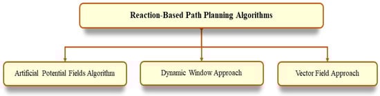 A reaction-based method refers to a strategy where the motion or trajectory of an agent is determined in response to real-time sensor or environmental changes, rather than relying solely on precomputed or global paths. The algorithms considered in the article are shown in Figure 5.