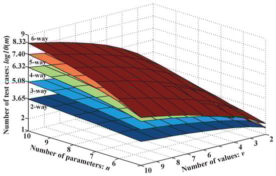When constructing the t-way combinatorial test suite based on the LCIT, each row of the LCIT corresponds to one test case. All rows of the LCIT constitute a t-way combinatorial test suite. Figure 1 shows an estimation of the number of t-way combinatorial test cases.