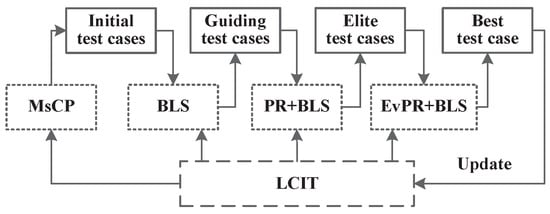 Aiming to solve the t-wCCM problem, a refined evolutionary heuristic (REH) algorithm is proposed, as shown in Figure 2. Firstly, construct the t-way LCIT and use the Multi-start Construction Procedure (MsCP) algorithm to generate an initial solution set. Secondly, use the low-complexity Balanced Local Search (BLS) algorithm to optimize the initial solution set, generating a guiding solution set. Thirdly, introduce Path Relinking (PR) combined with BLS (PR + BLS) algorithm to optimize the guiding solution set, generating an elite solution set. Fourthly, use the Evolutionary Path Relinking combined with the BLS (EvPR + BLS) algorithm to iteratively optimize the elite solution set, converging to the optimal solution set.