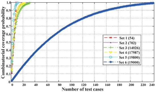 Utilizing the t-way combinations coverage feature of the LCIT, the number of 2-way combinations for each test instance can be quantified, annotated in Figure 4. The six growth curves of 2-way combinations coverage during the test suite generation process by the proposed REH algorithm are statistically analyzed.