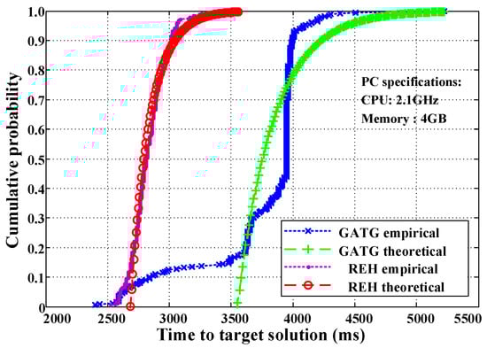 The time-to-target method [42,43] is used to analyze the convergence efficiency of the proposed REH algorithm. The computation time consumed by multiple independent runs is used to fit the probability distribution curves of the computation time. The algorithm stopping criterion achieves the specified coverage target for the t-way combinatorial test suite, i.e., the algorithm terminates when the test suite covers all t-way combinations defined by the LCIT.