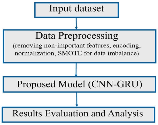 This section presents the development of the proposed hybrid deep learning model (CNN-GRU) for detecting intrusions in IoT networks. The aim of this study is to classify network traffic into normal and attack categories. Our approach involves data description, data preprocessing, model development, model evaluation, and result interpretation, as illustrated in Figure 1.