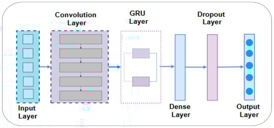 This study proposes a novel CNN-GRU hybrid model designed to enhance intrusion detection for IoT networks. The rationale for this design capitalizes on the complementary strengths of both models as CNNs excel at extracting spatial features, while GRUs are adept at capturing temporal dependencies in sequential network traffic. This integration significantly strengthens a robust and generalizable detection system that is less prone to overfitting and bias. As illustrated in Figure 2, the architecture sequentially incorporates an input layer, convolutional and pooling layers, a GRU layer, a dense layer, a dropout layer, and a final output layer.