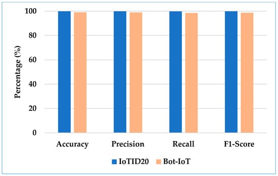 The performance of the proposed CNN-GRU model was rigorously evaluated on the completely unseen test set. As shown in Figure 3, the CNN-GRU model achieved an accuracy of 99.83% on the modified versions of the IoTID20 dataset and 99.01% on Bot-IoT dataset. On the IoTID20 dataset, the model obtained a precision of 99.83%, a recall of 99.82%, and an F1-score of 99.83%, while on the Bot-IoT dataset, it achieved a precision of 98.94%, a recall of 98.53%, and an F1-score of 98.73%. These results indicate that CNN-GRU can effectively capture complex spatial–temporal features of IoT traffic, enabling highly accurate detection of both benign and malicious instances. The slightly lower performance on the Bot-IoT dataset likely reflects the higher variability and complexity of attacks in this dataset. Overall, the consistently high accuracy, precision, recall, and F1-score highlight CNN-GRU as a reliable and generalizable approach for intrusion detection in diverse IoT network environments.