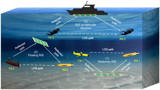 Water has high conductivity and is, therefore, unsuitable for radiofrequency (RF) transmissions. The most feasible types researched for UWCs are optical and acoustic links, each with benefits competing with the other. Underwater optical wireless communication (UOWC) is established by transmitting photons in the visible-light spectrum. The speeds, bandwidths, and data rates are very high, with frequencies in the THz regime, and achieve low latencies, but are principally line-of-sight (LOS) links that are extinguished within tens of meters from high attenuation based on water clarity [2]. Underwater wireless acoustic communication (UWAC), on the other hand, propagates ultrasound waves. These can travel several kilometers and envelop around obstacles but are limited to frequencies of a few kHz and are affected by Doppler shifts and multipath receptions. Magnetic induction-based UWCs have also been explored but are comparatively less mature. The research to date suggests that RISs may be utilized to overcome the limitations of UOWCs and UWACs.