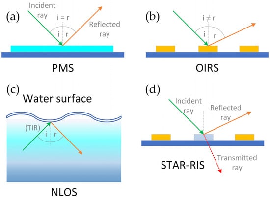 A depiction of the different reflection types discussed for UOWCs. The green arrows show the incident rays, and the orange arrows show the reflected rays (a) When using passive mirrors, the angle of reflection, r, will be identical to the angle of incidence, i. (b) In OIRS, beam steering allows a greater level of control over the reflected path. This could be achieved with RIS elements mounted on actuators, or by dynamic adjustment of dielectric properties of meta-elements. (c) NLOS paths may be achieved also using sea surface for TIR. (d) Simultaneously transmitting and reflecting (STAR) RISs can extend connectivity to both half-spaces on opposing sides. The red dashed arrows show transmitted rays.