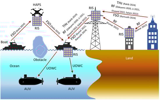 A triple-hop scheme (RF-RIS-RF to FSO-RIS-FSO to UOWC) is explored under different modulation schemes: differential binary phase shift keying (DBPSK), non-coherent binary phase shift keying (NCBPSK), coherent binary phase shift keying (CBPSK), and coherent binary frequency shift keying (CBFSK) [25]. Overall, CBPSK showed superior average BER performance compared to other schemes. A dual-hop FSO and UOWC relay system was further studied for the benefits of integrating RIS [26]. It uses an infrared FSO at 1550 nm and a UOWC at 530 nm. They model the effects of the system under weak, moderate, and strong skip-zones due to occlusions and blockage, providing the closed-form equations for SNR, outage probability, and BER. CBPSK, once again, outperforms the other modulation schemes of NCBPSK, CBFSK, and non-coherent binary frequency shift keying (NCBFSK), with RIS-assisted links outperforming the direct link under occlusions. In a similar thread, a THz (RF) to UOWC, RIS-based relay system has been investigated using an distribution, with similar performance improvements when using the RIS system and under pointing errors, turbulence, and bubbles. CBPSK performed better than CBFSK and non-binary PSK [27]. The RIS may also be used as a high-altitude platform station (HAPS)-based dual-hop relay to mitigate occlusions on the ocean surface. Deka et al. derive the analytical expressions for outage probability, BER, and SNR for such an application, and show that for such schemes using FSO and UOWCs, the orientation of the HAPS and the optical beam waist are key parameters to maintaining link performance [28]. CBPSK outperformed NCBFSK here. Table 5 summarizes these works, and Figure 3 illustrates the different systems discussed.