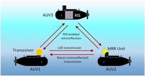 The application strategies involving RIS multiuser communication are being developed. Given the change of medium, although terrestrial strategies can be translated, they need to be purposefully designed. An OIRS, by design, is fundamentally meant to support multiple users by dynamically grouping and allocating reflector elements based on the channel state information [34]. Salam et al. explore equal mirror assignment (EMA) and distance-based mirror assignment (DMA) against conventional orthogonal multiple access (OMA), non-orthogonal multiple access (NOMA), and rate-split multiple access (RSMA) as a means of improving aggregate spectral efficiency (ASE) and preserving user fairness [34]. The performance variations are analyzed against ocean depth as well for clear, open oceanic and coastal stratification conditions S1 and S8, respectively [35]. The results show that for ASE with N of six users, DMA performs the best, followed by EMA. OMA is better than NOMA and RSMA at low transmit power, due to NOMA and RSMA-based users experiencing interference from simultaneous transmissions. However, with increasing transmit power, RSMA appears more spectrally efficient than both NOMA and OMA. With a fixed transmit power of 37 dBm and 16 OIRS elements of 16, DMA is still showing superior spectral efficiency than EMA, OMA, NOMA, and RSMA, with increasing aggregate number of users. With respect to the fairness index, OMA appears to be the best, closely followed by DMA, EMA, and RSMA, with NOMA showing the worst performance with an increasing number of users. DMA, appearing as the more suitable scheme, is further analyzed under turbulence and pointing errors, and attenuation, showing worsening performance under increasing effects. Thereafter, the performance vs. depth is observed. However, we deem these adopted coefficients doubtful, as explained in Waduge et al. [36], where the coefficients have been revised. For example, it is unlikely that a coastal S8-type environment could be 450 m deep [36]. For the ease of the reader, we have summarized the details regarding oceanic stratification under Section 4.1.1 and have subsequently provided the equations and coefficients. Alternatively, the underwater deployment of a simultaneous transmit and reflect (STAR)-RIS system has also been analyzed by Naik et al. [37]. The uniqueness of a STAR-RIS over the conventional RIS is its ability to transmit or direct the oncoming beam into the opposite half-space, a key requirement for underwater deployments. This capability would offer expanded degrees of freedom for controlling signal propagation, substantially enhancing design flexibility to meet stringent communication requirements. Benea-Chelmus et al. [38] demonstrated the first optical STAR-RIS using a two-state electro-optical plasmonic metamaterial surface. They achieved this by combining two anisotropic materials, liquid crystal and terthiophene, enabling precise control over the direction of reflected and transmitted beams. Details of a liquid-crystal-based RIS and optical beam transmission using terthiophene are available in Ndjiongue et al. and Matsuo et al., respectively [8,39]. In the underwater system, the STAR-RIS shows a two-fold improvement of received luminous intensity at the receiver, possibly due to it being an intermediate node that focuses the beam compared to the direct, LOS link, which continuously diverges with propagation [37]. Analytical results show that STAR-RIS achieves 5 × 10−4 BER at 26 dB, while the five-element RIS does so at 32 dB compared to the direct link at 68 dB. The STAR-RIS showed significant improvement in outage performance compared to the direct link, for both IMDD and heterodyne schemes. Channel capacity is also higher due to obtaining the strongest signal with the increased number of transmit-reflect elements over the direct UWOC link and full-space coverage over the regular RIS, which provides coverage to one half-space. Lastly, similar to works discussed in the previous sections, heterodyne detection of BPSK showed the best BER performance, followed by HD BFSK, and then IMDD OOK and 16-QAM. Finally, a completely unique implementation is proposed by AbdElKader et al., where a RIS-assisted modulating retroreflector (MRR) system employs the spectral-power-efficient L-ary Quadrature Amplitude Modulation Multipulse Pulse-Position Modulation (LQAM-MPPM) [40]. An MRR is usually made with an external light modulator and a passive reflector. It operates by encoding the data onto the incoming light signal, which is then reflected to the destination. Results comparing 4QAM-MPPM to MPPM, and 8QAM-MPPM to 4QAM show that the BER and power-efficiency of L-QAM-MPPM is better than the conventional case in attenuation, turbulence, and pointing error conditions. This was further improved with a greater number of RIS elements, but it is particularly contingent on where the RIS is placed between the transmitter and the MRR. Figure 4 illustrates the strategy.