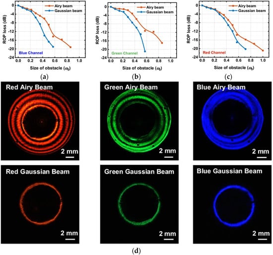 Comparison of loss in ROP between Airy beam and Gaussian beam for different sizes of obstacles in (a) red channel (637 nm), (b) green channel (517 nm), and (c) blue channel (455 nm). The obstacle size is normalized to the beam aperture of approximately 14 mm. The images and results are from Hu et al. [43]. In (d), the top three are beams received with the metasurface, and the bottom three are the regular Gaussian beams. Table 8 summarizes these works.