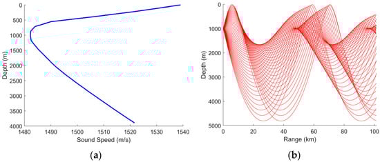 Underwater acoustic channel based on ray propagation. (a) Sound speed profile. (b) Propagation loss of underwater acoustic channel.