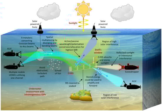 - Optical-RIS for UOWCs: Surveys the existing O-RIS state-of-the-art from four perspectives—channel modeling of purely underwater O-RIS-based systems, and systems where RIS is above the water, but may have been used to assist a UOWC; towards enhancing physical layer security; enabling multiuser access, and finally, the works on metasurfaces for underwater applications that could potentially be adopted for O-RIS underwater.