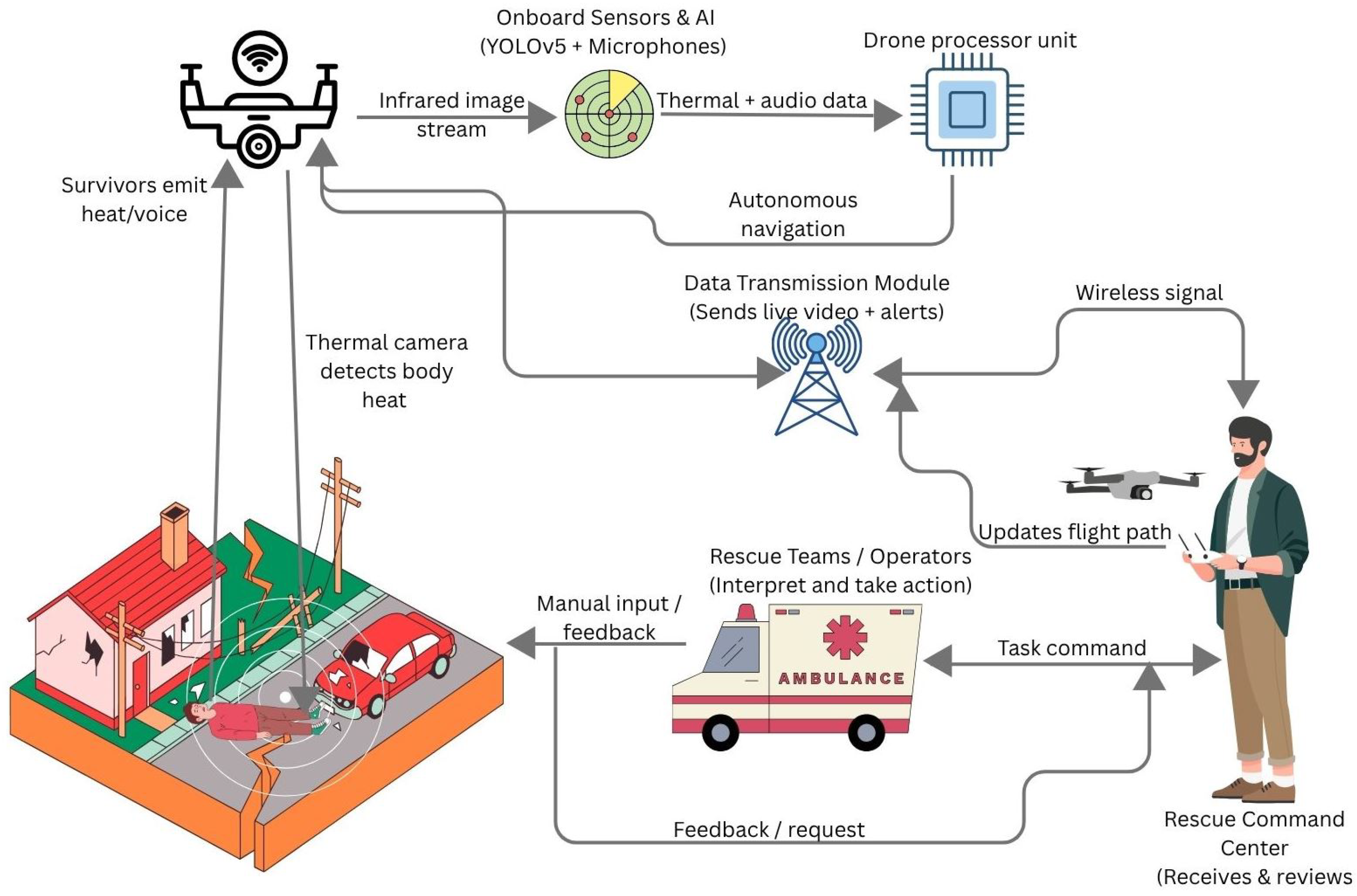 - Most imaging and sensor technologies in drones are not stand-alone systems; they could provide greater benefits when integrated with wireless networks, big data, and AI. This combination enables real-time data processing, enhancing the accuracy and effectiveness of disaster response operations.