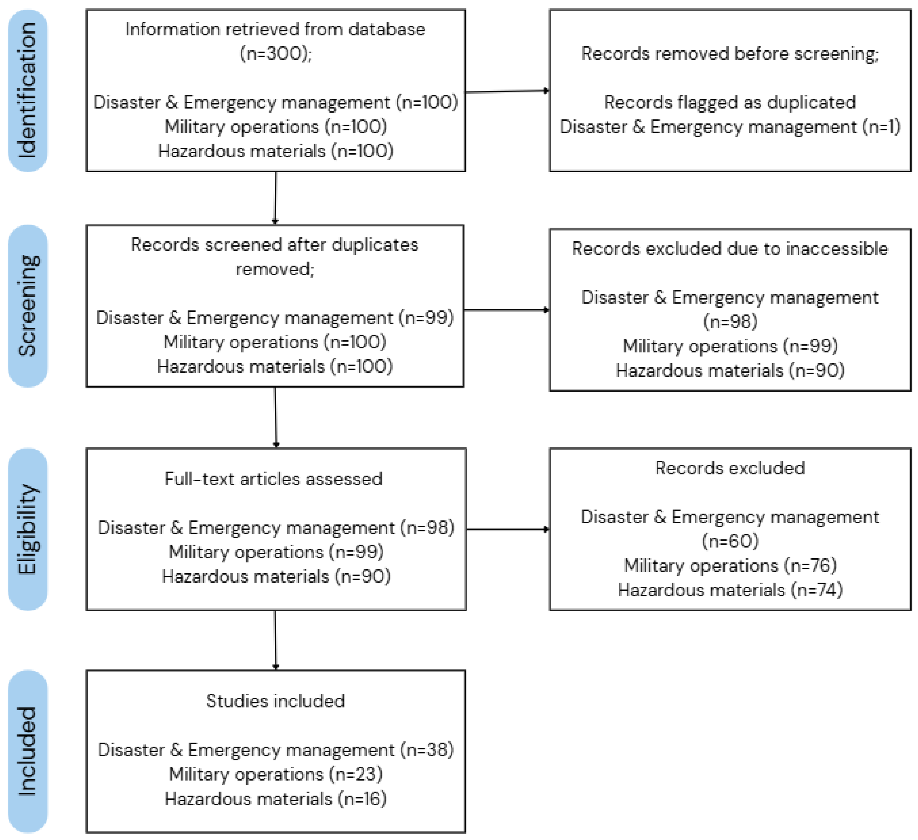 - Some research works were excluded from the results in the military context because the technologies were primarily applied in geological, environmental, and marine surveillance, overlapped with disaster and emergency management studies, or utilized for tracking, delivery services, and general surveillance applications. This suggests that the search query included the term ’surveillance,’ which is broadly used across various non-military industries.