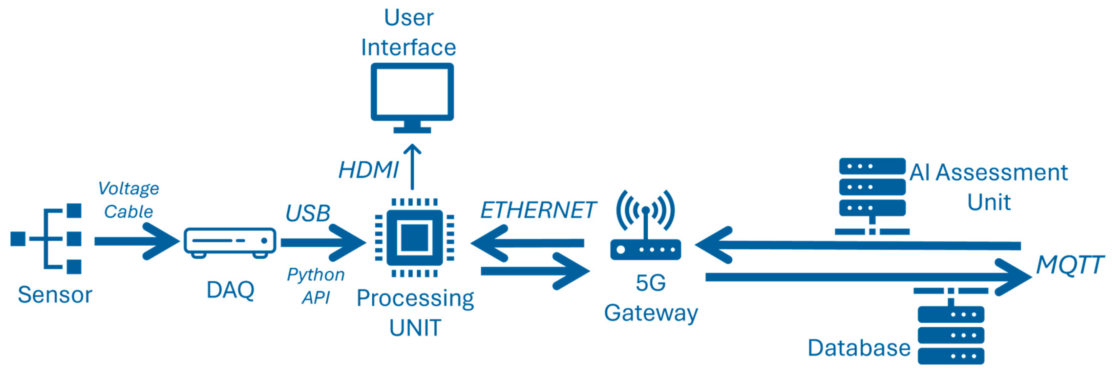 The monitoring system consists of three different entities. The first entity is the data sampling module. The data sampling module consists of the sensing element, the data acquisition device, the local processing unit, and the operator’s graphic interface (GUI). The sampled data are transferred through a local processing unit to a private communication bus that pushes the sampled information outside the facility for assessment and storage, utilizing the available 5G connection.