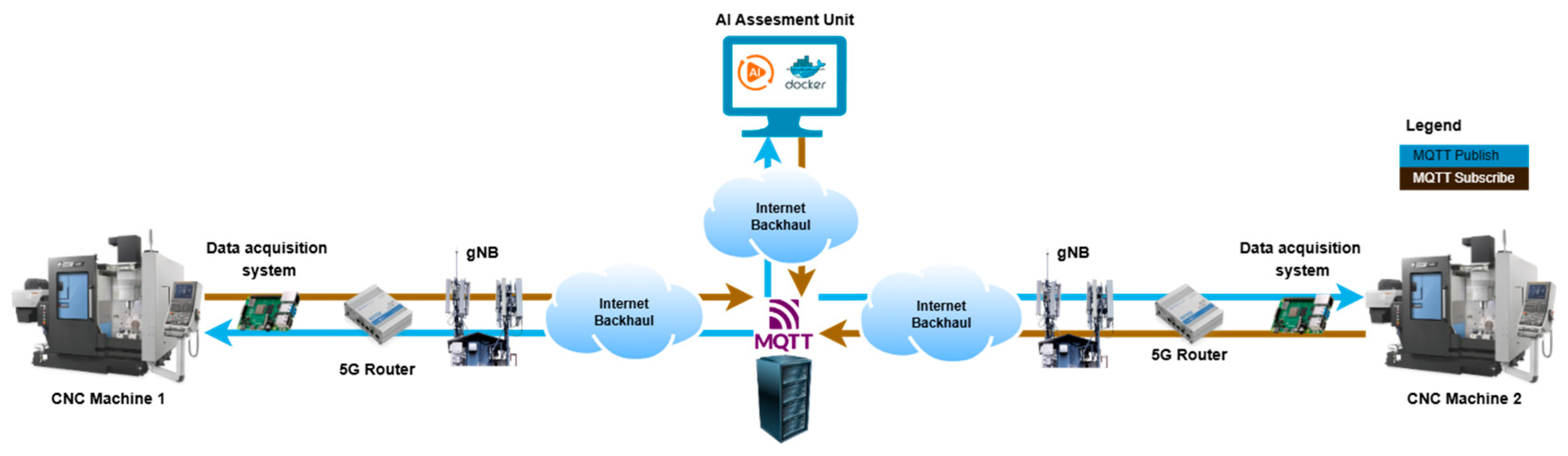 For the communication protocol between the interest areas, the MQTT protocol was selected. MQTT is a lightweight messaging protocol ideal for IIoT applications as it offers secure data transmission and an easy scalability path for integrating more nodes, utilizing the publish/ subscribe model. For the study, a private MQTT broker was developed, and two different milling machines were operating on the communication bus. The MQTT communication was tunneled through a VPN for enhanced security and network isolation.