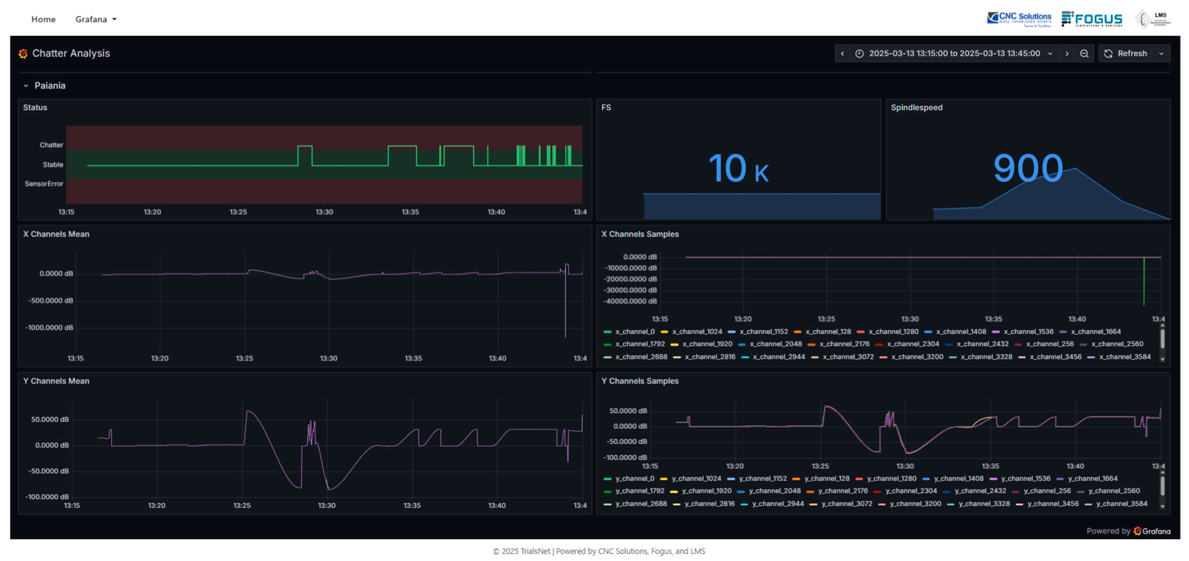 For the data storage module, the implemented solution is an Influx DB time-series database. The database employs a Telegraph agent that connects to the communication bus and stores the raw data and assessment result in the database. Additionally, a Grafana dashboard that utilizes the stored information can provide clear insights regarding machine operation during milling. The dashboard provides a thorough review of all the machines connected to the network, beneficial for everyone that wants to be updated regarding the status of each machine without being present on the machine floor, as presented in