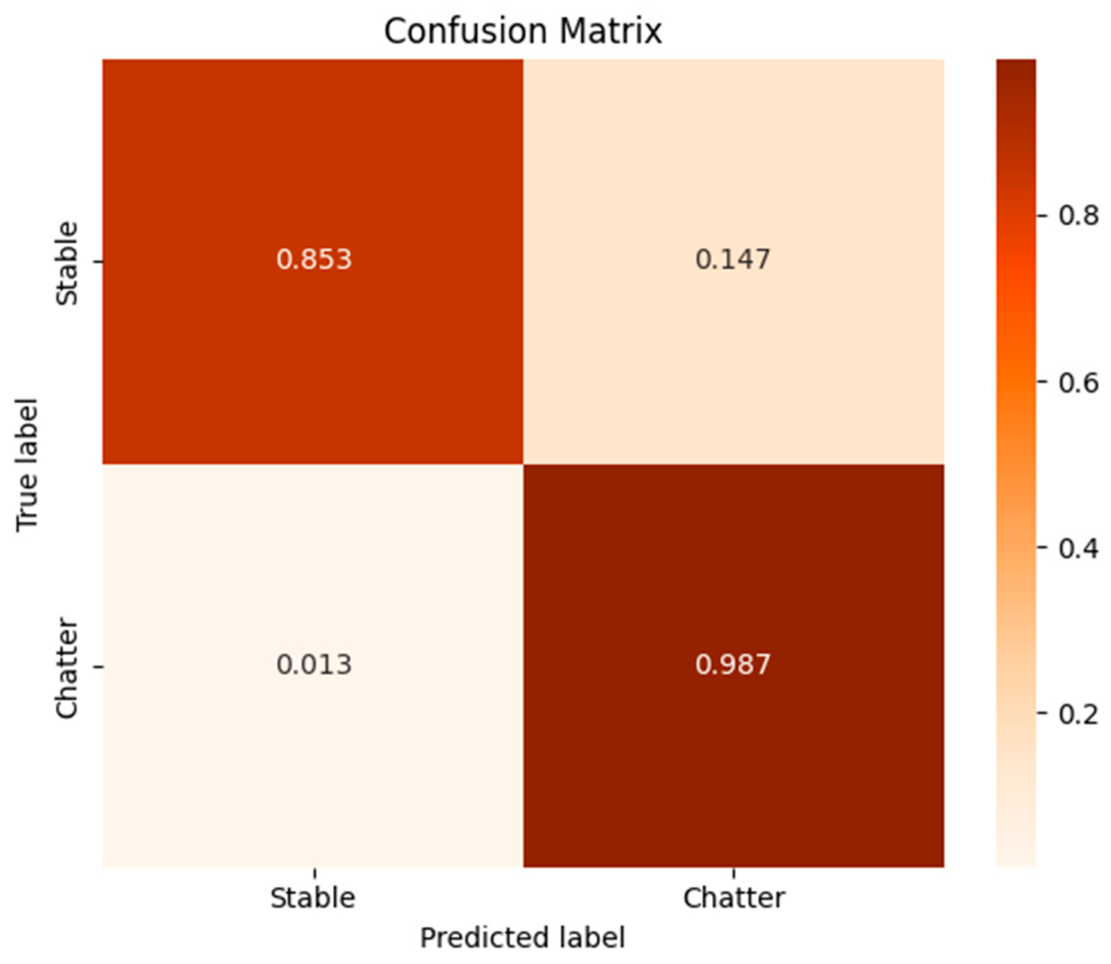 Figure 5 presents the normalized confusion matrix obtained on the test dataset, depicting the classifier’s ability to distinguish stable cutting from chatter events with high reliability. The model achieved excellent performance, with most chatter events correctly identified and minimal false positives, demonstrating its applicability for real-time monitoring in industrial settings.