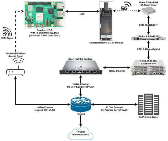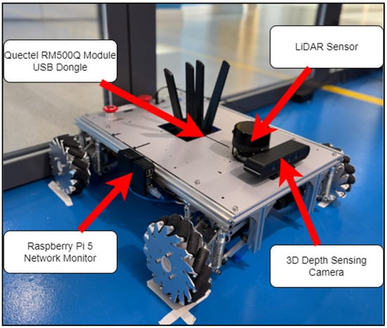 The Raspberry Pi 5 is integrated as a dedicated edge node for network diagnostics and telemetry handling. Running Ubuntu 23.10 with a 2.4 GHz quad-core CPU, 8 GB DDR4 RAM, and NVMe SSD storage, it maintains a Gigabit Ethernet link to the Jetson Orin Nano for low-latency exchange of telemetry data. This Ethernet connection allows Wi-Fi and 5G NR performance metrics (via the onboard Wi-Fi and Quectel RM500Q-GL modem [36]) to be directly correlated with robot position and mission context, enabling location-aware assessment of wireless performance.