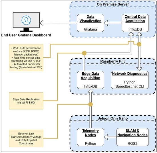 Figure 3 illustrates the logical data flow of the proposed three-layer framework, from perception and control on the Jetson Orin Nano through Edge Data Acquisition and Network Diagnostics Layer deployed on the Raspberry Pi 5, and a Data Management and Visualization Layer hosted on an on-premise server running InfluxDB and Grafana. This hierarchical design provides clear functional separation while maintaining synchronized telemetry across all components.