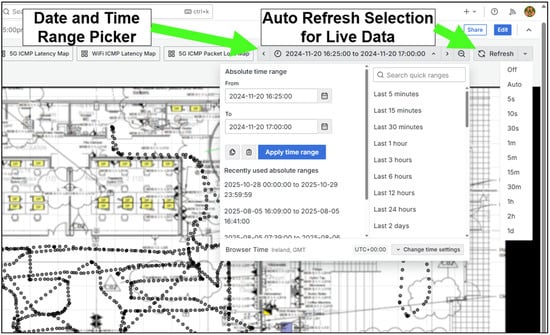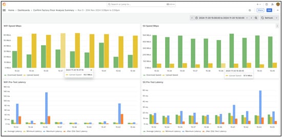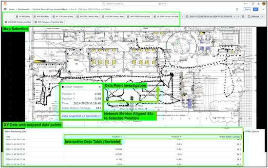 Visualization and analysis are achieved using Grafana [18,19] dashboards, allowing real-time monitoring and post-run investigation of latency, signal strength, throughput, and data loss which is mapped against the robot’s navigation route. This approach empowers engineers to correlate network performance anomalies with physical location, mobility behaviour, or protocol transitions, thereby supporting targeted infrastructure tuning and operational decision-making.