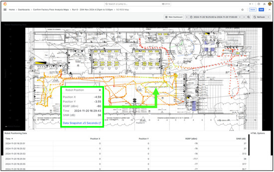 An additional dashboard overlays real-time X–Y coordinate data onto a 2D map of the facility. Signal strength, latency, and throughput values are sampled at corresponding positions and rendered as colour-coded markers. Users can inspect individual points and retrieve synchronized telemetry within a narrow time window, enabling granular, spatially contextualized assessment of wireless performance along the robot’s trajectory.