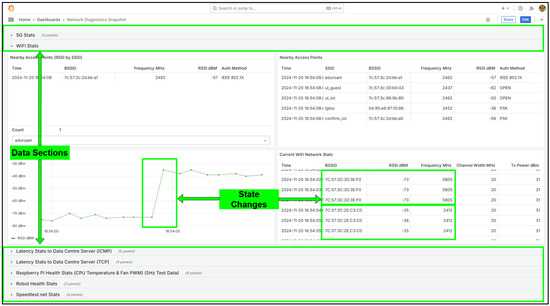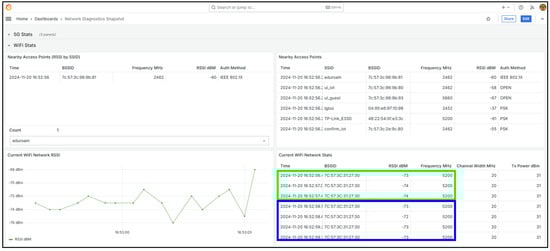 In addition to monitoring the primary Wi-Fi link, the system periodically performs environmental scans to detect neighbouring access points and characterize the surrounding RF environment. Scans are executed on the Raspberry Pi 5 using the onboard wlan0 interface and the native iw utility, with the output parsed via the jc JSON parser to produce structured records. This provides insight into signal overlap, interference sources, and network density across the 2.4 GHz and 5 GHz bands. The acquisition pipeline follows the same pattern as the Wi-Fi link metrics, a lightweight Python script (using the os and InfluxDB client libraries) runs with superuser privileges, extracts the parameters summarised in Table 1, and encodes them as JSON arrays for insertion into the on-premises InfluxDB instance. Payloads are transmitted over both Wi-Fi and 5G interfaces to maintain redundancy and continuity of reporting. The scan-and-upload cycle operates at an interval of approximately 200 milliseconds, primarily constrained by the execution time of the iw dev wlan0 scan command on the Raspberry Pi 5.