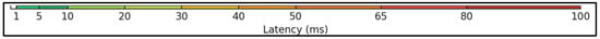 The first scenario involves comparing ICMP latency performance across 5G and Wi-Fi communication channels using Grafana’s XY chart visualization. These charts allow latency to be spatially interpreted, with colour gradients representing latency intensity. Figure 10 presents the latency colour scale used in the dashboard. Although displaying this scale is optional, individual data point values can also be inspected by clicking directly on the data points on the chart.
