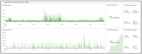 Each script was bound to a single interface and issued ICMP echo requests with a 56-byte payload and a 2 s timeout at intervals of approximately 0.5 s. The resulting metrics for both 5G and Wi-Fi were parsed into JSON payloads and written to the on-premises InfluxDB time-series database. Data delivery was supported over both interfaces to preserve continuity and redundancy.