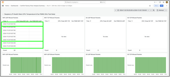 This third scenario demonstrates the Grafana dashboard’s capability to detect and analyse communication degradation in IIoT telemetry streams. Specifically, it focuses on the continuity of a high-frequency (5 Hz) data stream consisting of CPU temperature and fan PWM speed readings from the Raspberry Pi. These metrics are transmitted to the database over four distinct network paths: TCP over 5G, TCP over Wi-Fi, UDP over 5G, and UDP over Wi-Fi.