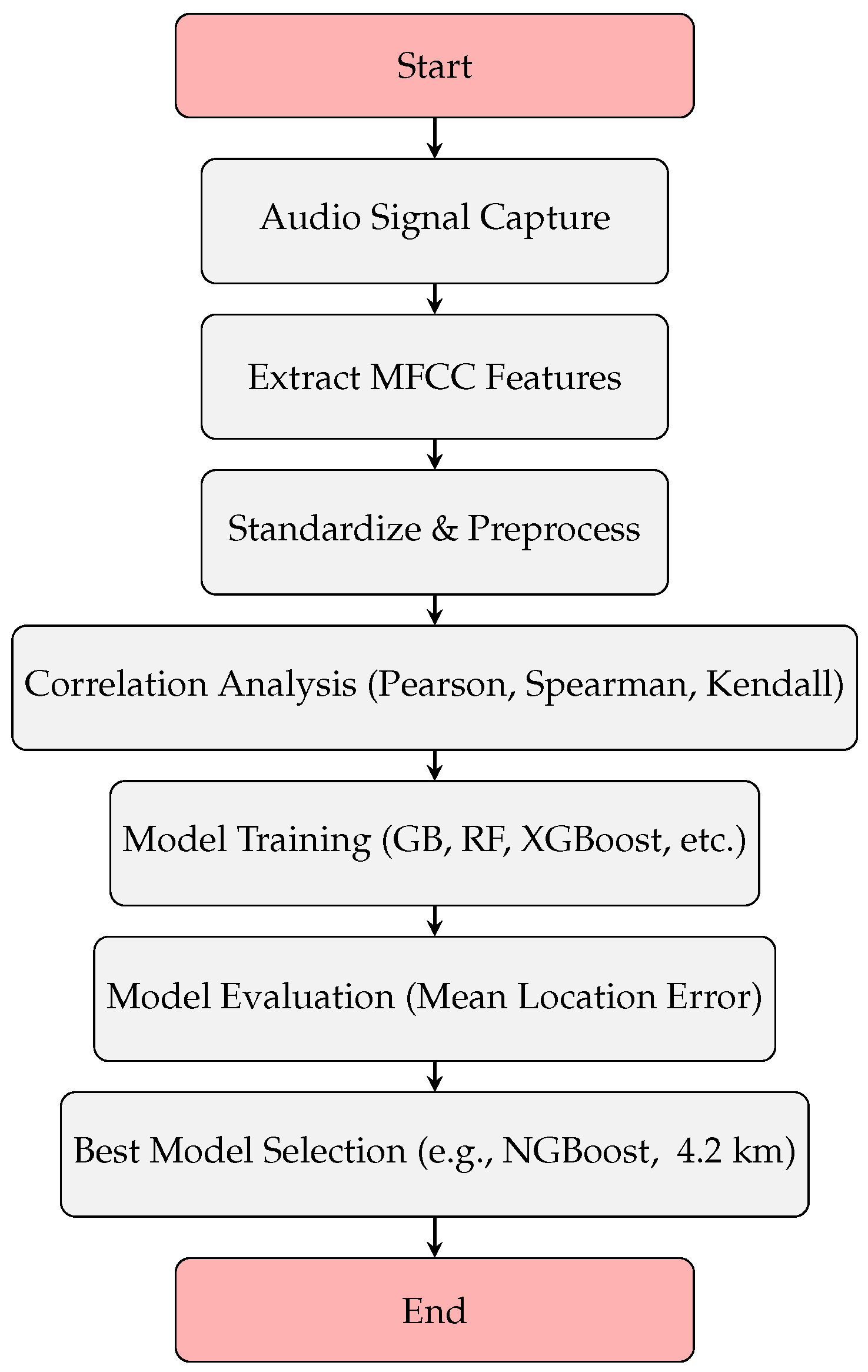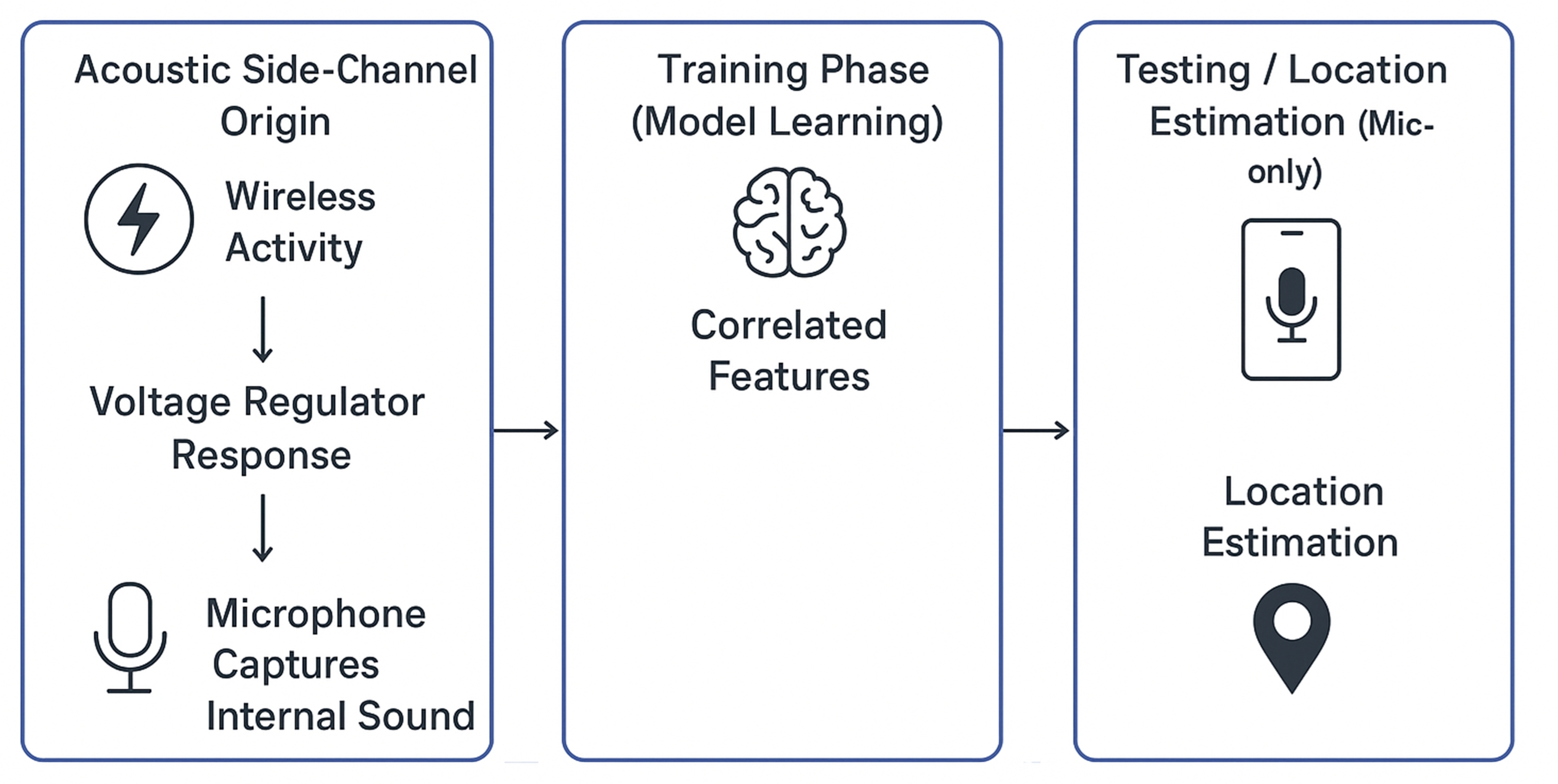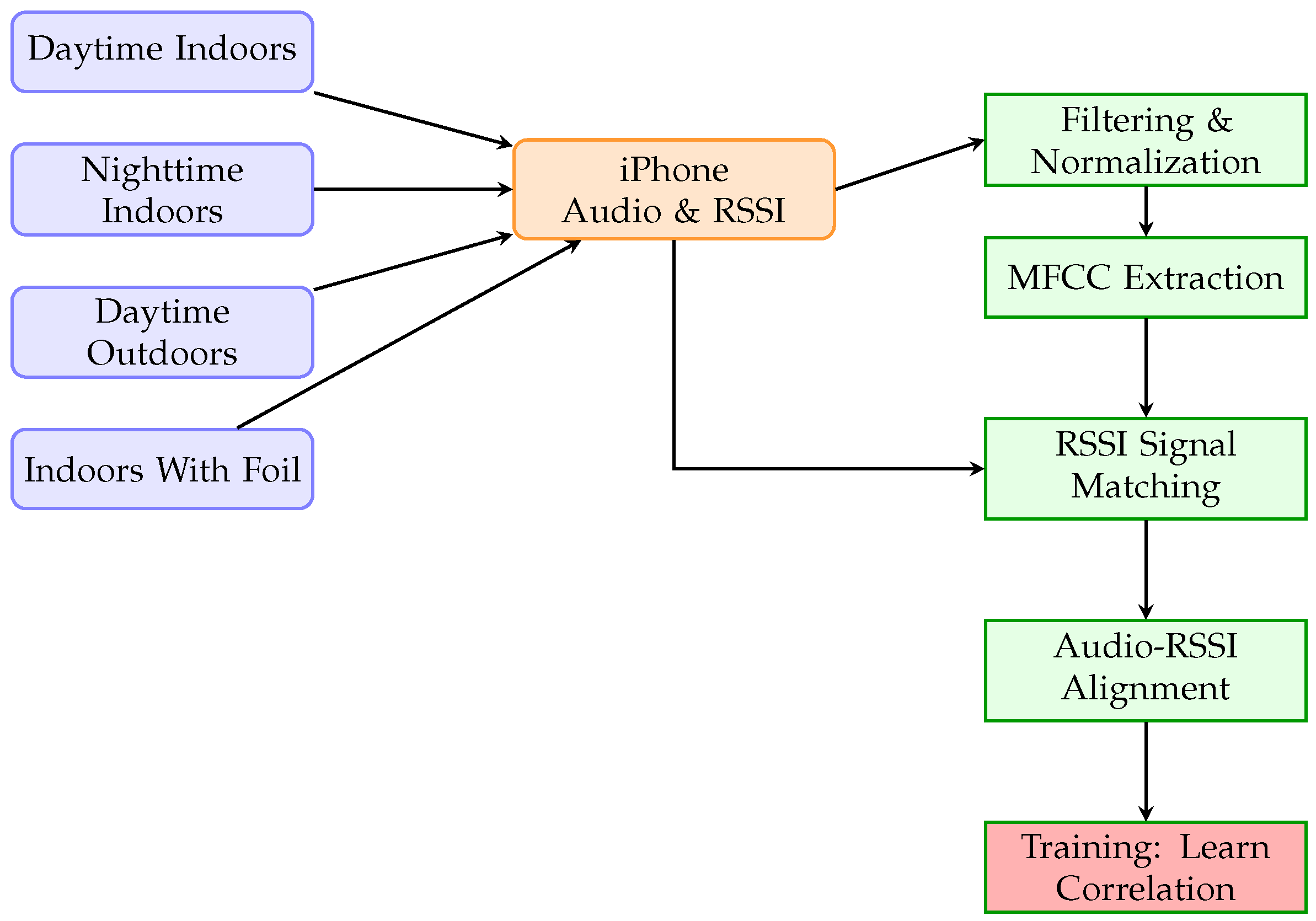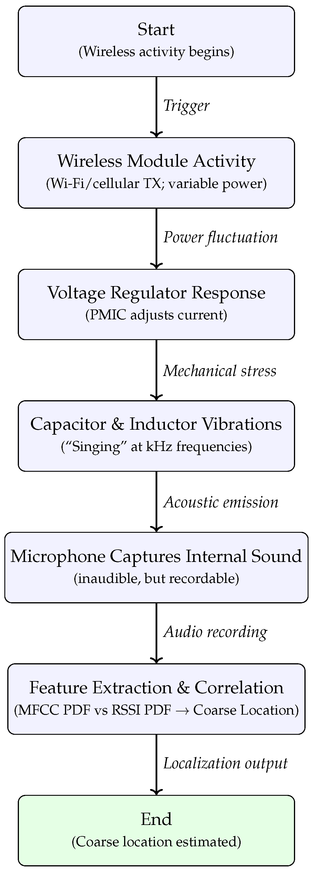 | Amro et al. (ISQED’25) [18] | 2025 | Yes (MFCC used on internal audio) | Indoor & Outdoor | No (offline change detection) | No (no absolute location estimation) | MFCC feature tracking and delta analysis with t-SNE and KNN | 10 locations; multiple smartphone sessions with calls triggered to induce wireless activity | Detect relative location changes between consecutive wireless events using internal acoustic emissions |