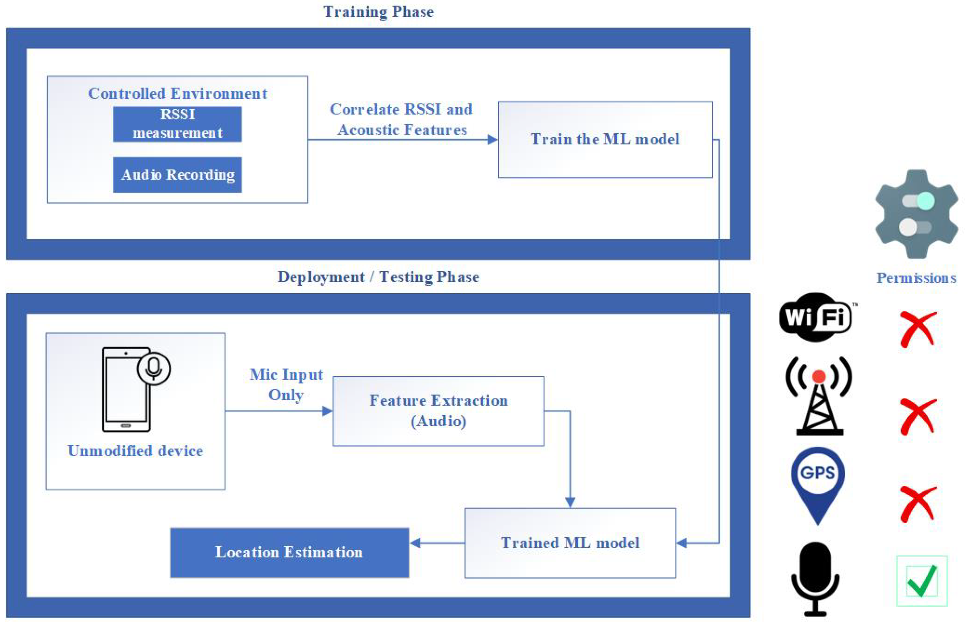 - Jeon, Y.; Kim, M.; Kim, H.; Yoon, J.W. I’m Listening to Your Location! Inferring User Location with Acoustic Side Channels. In Proceedings of the World Wide Web Conference (WWW), Lyon, France, 23–27 April 2018; pp. 339–348. [Google Scholar] [CrossRef]