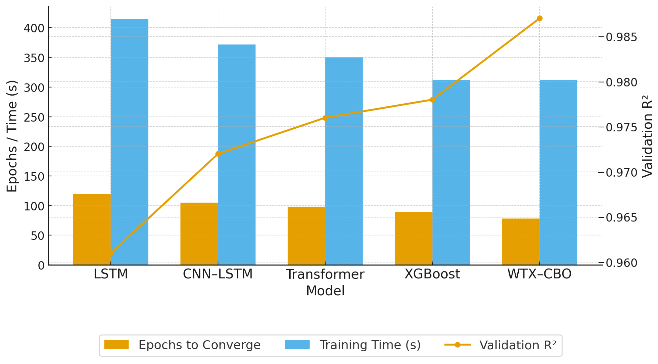 | WTX–CBO (Proposed) | Wavelet–Transformer–XGBoost | 0.0189 | 0.0283 | 1.87 | 0.987 | This study |