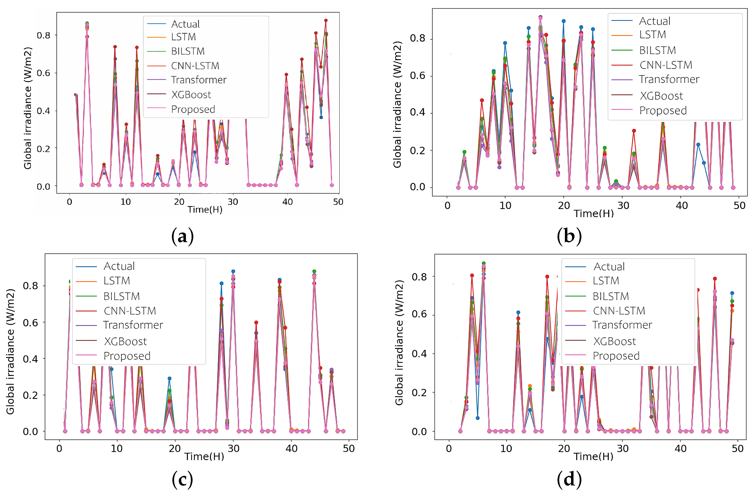 - Uncertainty quantification: Incorporating probabilistic inference or Monte Carlo dropout could provide confidence intervals for the predicted irradiance, enhancing reliability under abrupt weather transitions.