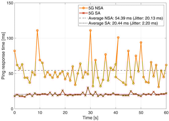 Round-trip latency (Ping RTT) measured between two IoT devices over 5G SA and 5G NSA networks.