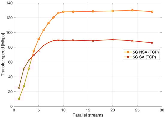 Another important finding is that the upload speed correlates with the number of parallel streams used in the data transfer. After using 10 parallel streams, the maximum bandwidth is reached. This is also a specific setting of the mobile network that needs to be changed in the future (based on multiple apps uploading and downloading data), as this blocks the full potential of the 5G network when using a specific communication protocol, and only the maximum bandwidth of a single stream can be achieved (as shown in the following sections).