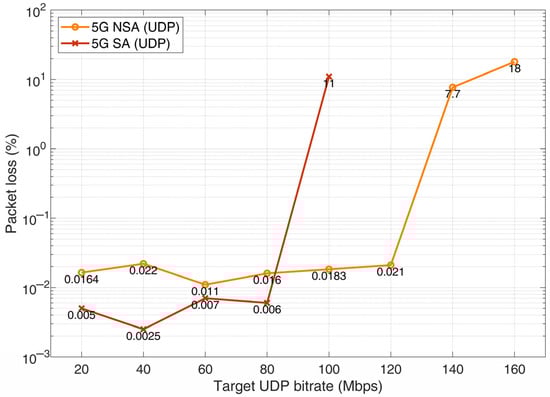 In addition to TCP throughput measurements, UDP packet loss was evaluated to assess network behavior under increasing uplink load (Figure 4) where each test was performed for 5 min. UDP tests were performed using iPerf3 by progressively increasing the target bitrate until network saturation was reached. Figure 4 shows the measured packet loss for 5G NSA and 5G SA configurations as a function of the target UDP bitrate.