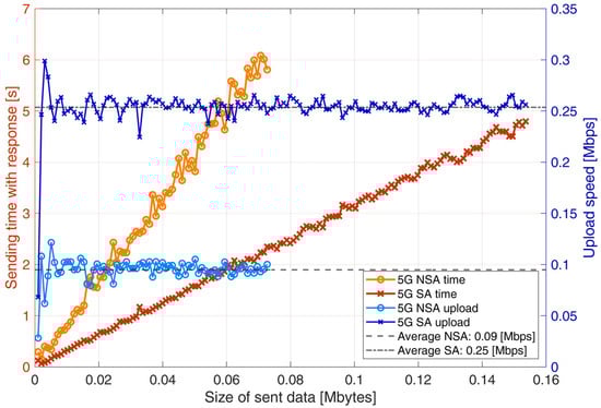 In this section, only the gRPC protocol was tested and used for comparison with others. The characteristics of the protocol (shown in Figure 11) are similar to those of CoAP and show a linear correlation between the size of the data sent and the sending time, regardless of the data size (as with MQTT or CoAP). The maximum upload speed is 0.09 Mbit/s for the NSA network and 0.25 Mbit/s for the SA network. There is minimal noise detected, which means that communication is not influenced by changing latency (Ping), especially in the 5G NSA network. The upload speeds are constant and not influenced by the sent packet size.