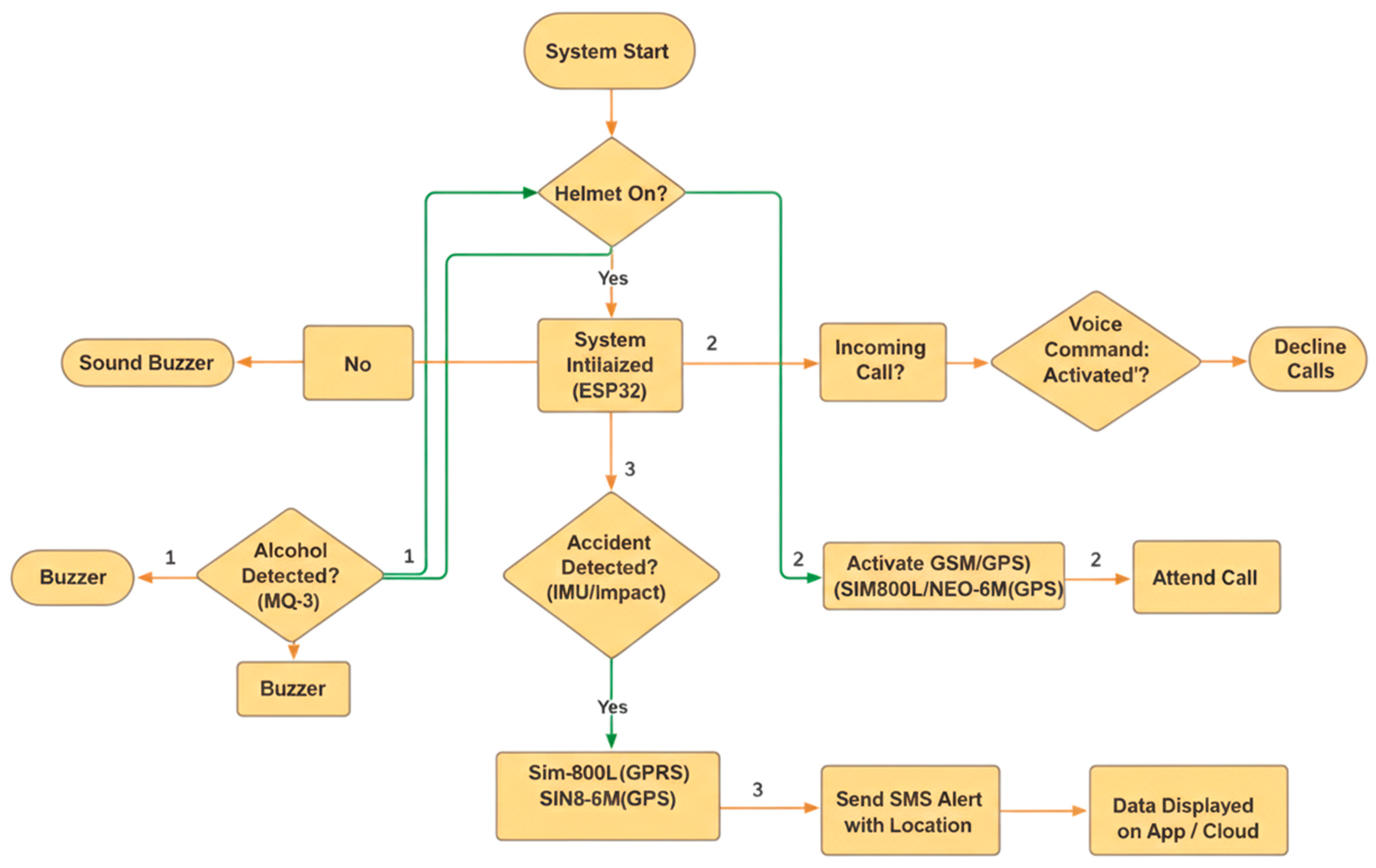 This method includes an emergency notification architecture of a smart helmet that is entirely independent of smartphones and the external computing devices. It also includes a dual sensor fusion mechanism, which is a synchronous tilt-angle escalation and impact detection within a specified time window to significantly minimize false alarms. It was a real-time embedded accident detection and reporting pipeline based on sensing, decision making, GPS localization and GSM communication implemented using a low-cost microcontroller.
