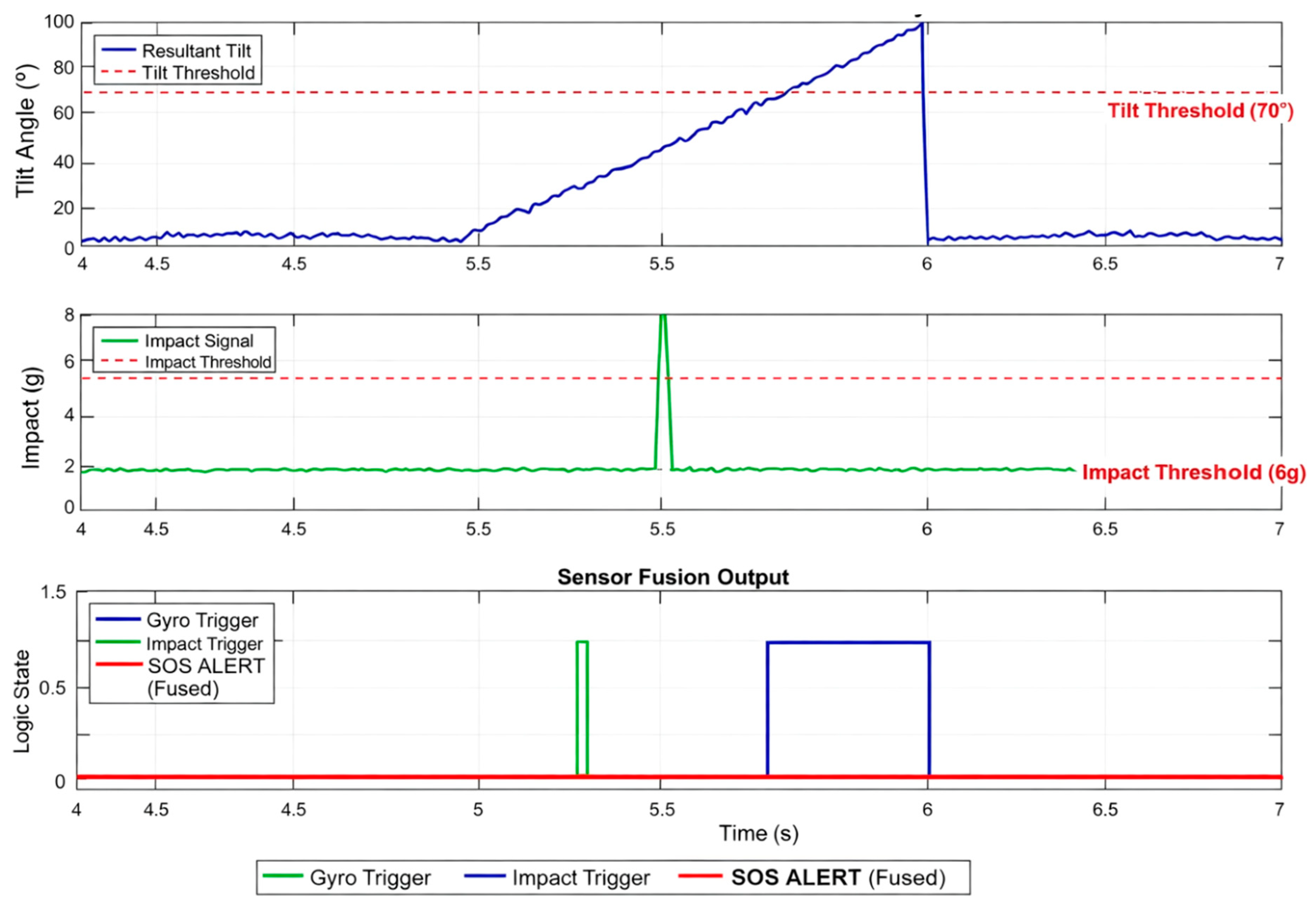 Figure 3. Regular riding control data is modeled with minor changes of pitch and roll as well as a simulated fall when the duration is 56 s, and the process is to approach a 56 s fall as seen in the data. At the same time, a signal of the impact sensor is produced with a Gaussian pulse at 5.2 s to simulate the forces of the collision process along with the normal vibration noise. There are tilt (180 degrees) and impact (1 g) thresholds set, and an accident detection logic is activated when both thresholds are passed both at the same time. The code maps the resulting tilt and impact signal, in addition to the fused detection logic, with the specific time that the SOS was activated. The output also displays the time of the accident detection, the maximum tilt, and the maximum impact that show that the system accurately detects a fall or collision event.