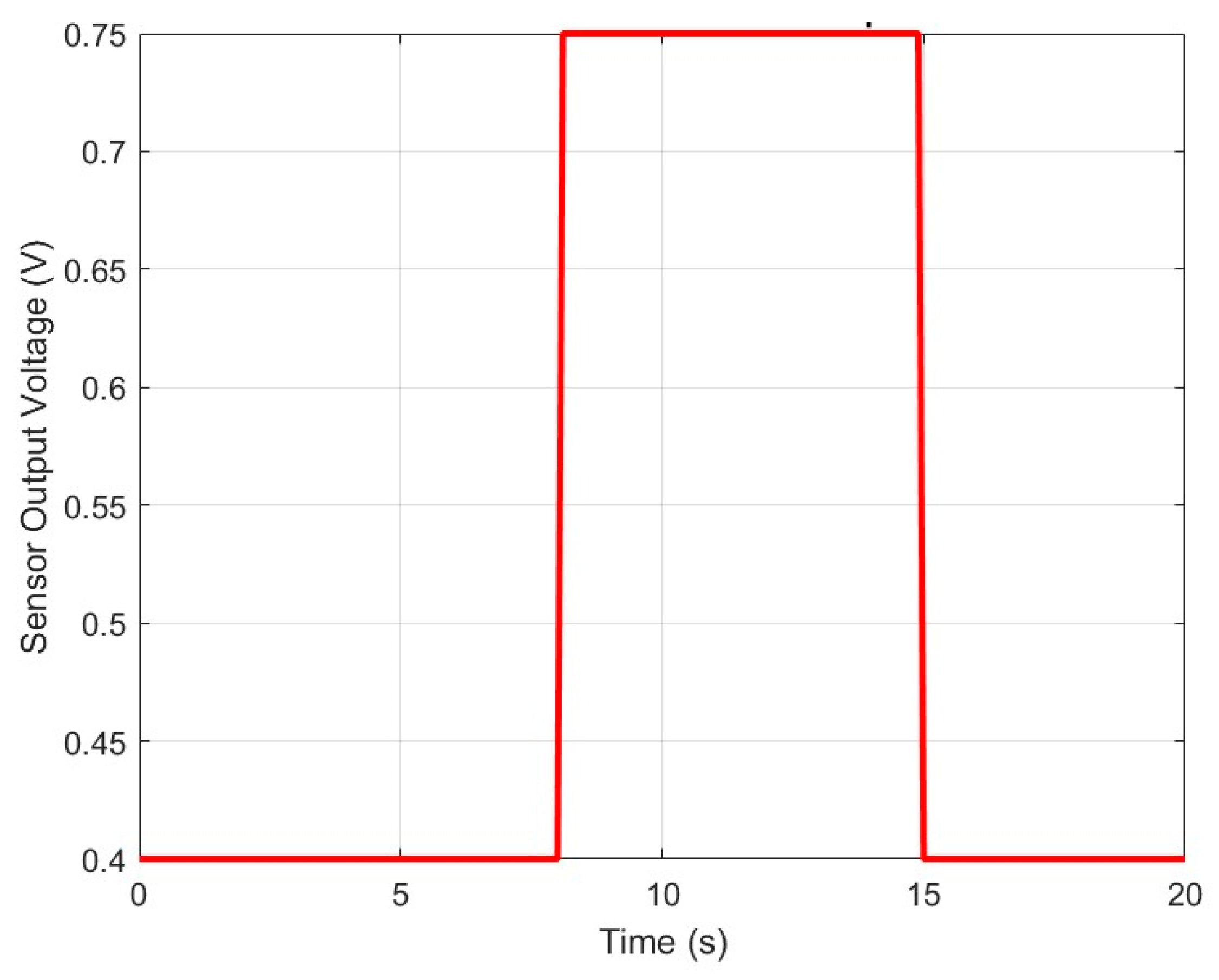 Figure 4: The sensor output is at a low base voltage when the sensor is operating under a normal condition. The noticeable increase in voltages between 8 and 15 s is an indication of the presence of alcohol. This behavior of response allows early detection of drunken riding, rider warning generation, and integration of ignition lock in the future.