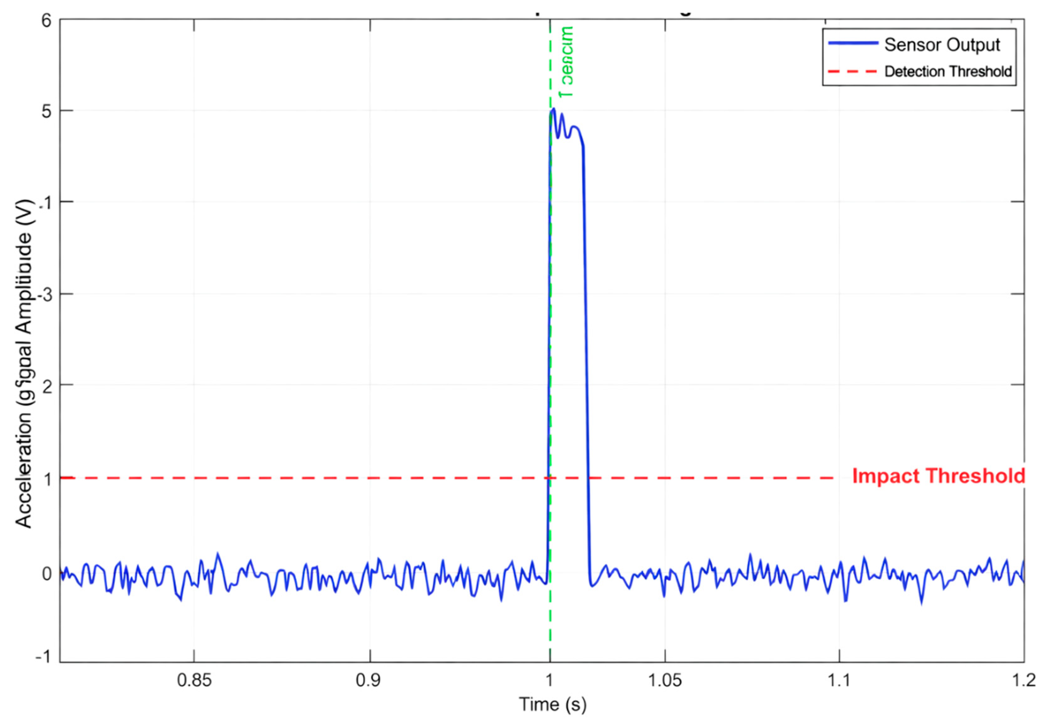 Figure 15 shows a typical MATLAB plot of normal riding motion, impact-induced maximum acceleration, and the resultant response to be detected. For the usual conditions of riding, the acceleration due to the result is below the predetermined threshold, and sudden impact occurrences result in a sharp peak, which is greater than the threshold for activation of the detection of accidents. This MATLAB description alone is a representation of the entire purposeful circulation of sensing, the decision-making process, and the recognition of events, hence, confirming the core rationality of the given smart helmet system.