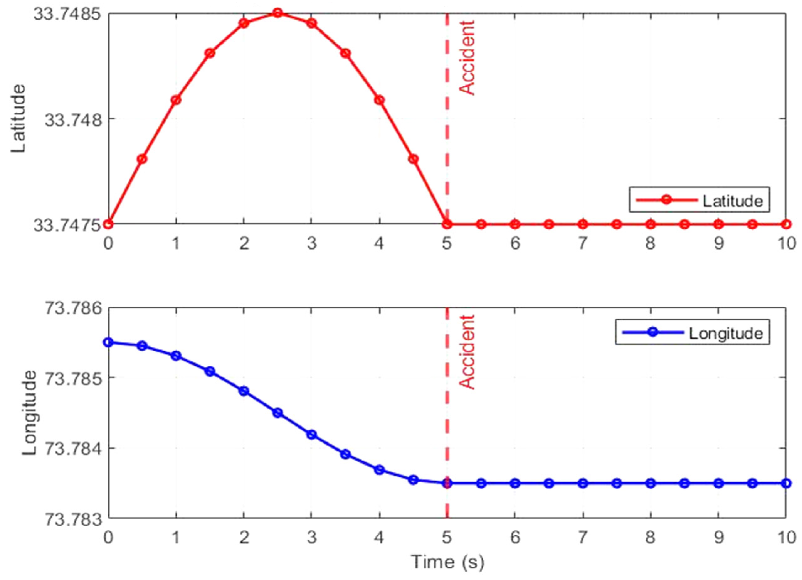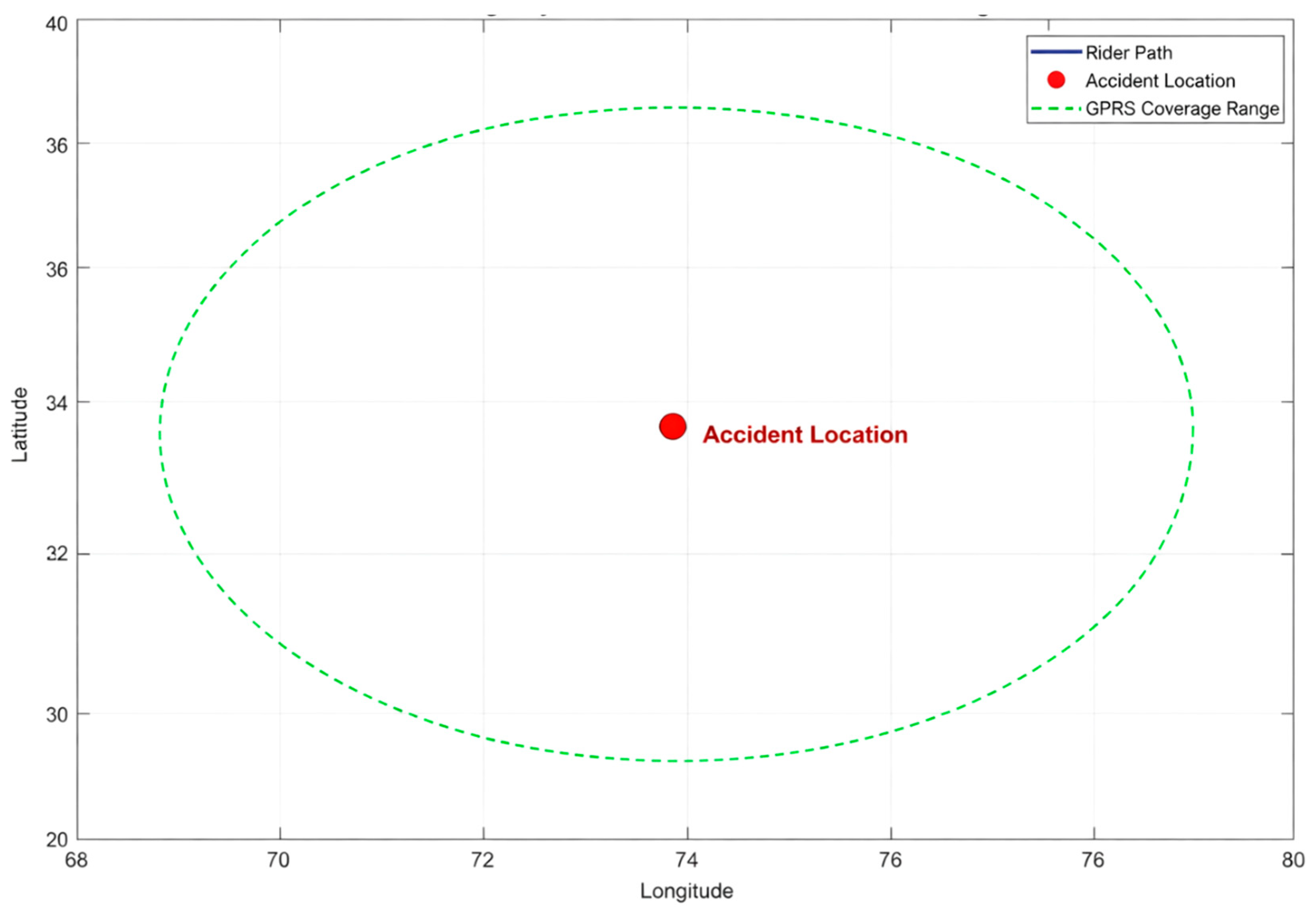 Figure 8. Normal movement is represented by small sinusoidal variations of latitude and longitude of the rider. When the simulated scenario falls (5 s), the coordinates cease to change, and the rider is stationary because of the accident. The former figure is a plot of the latitude and longitude versus time, in which there is a vertical line indicating the accident location. The second image displays the route used by the rider in a map, with the accident point being indicated using a red color on the map. The accident is surrounded by a circle that is a theoretical coverage area (5 km radius) by GPRS/GSM, and this area is where the emergency alert can be sent. As this simulation shows, GPS data could be utilized to identify the occurrence of accidents as well as give accurate location data. This is shown in