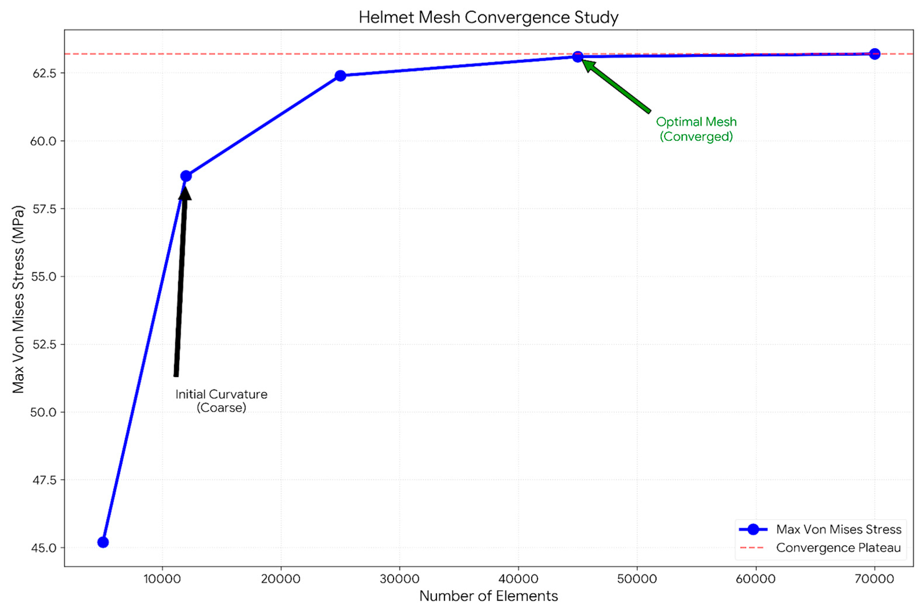 To ensure the reliability of these results, a Mesh Convergence Study was performed. Initially, the “Initial Curvature” phase (from 5000 to 25,000 elements) showed significant fluctuations in stress values as the 3D tetrahedral mesh began to better resolve the helmet’s geometry. Optimal Mesh Convergence was achieved at approximately 45,000 elements, where the maximum stress stabilized at 63.1 MPa. This plateau confirms that the discretization error is minimized, and the FEA model is numerically stable for qualitative and quantitative assessment.
