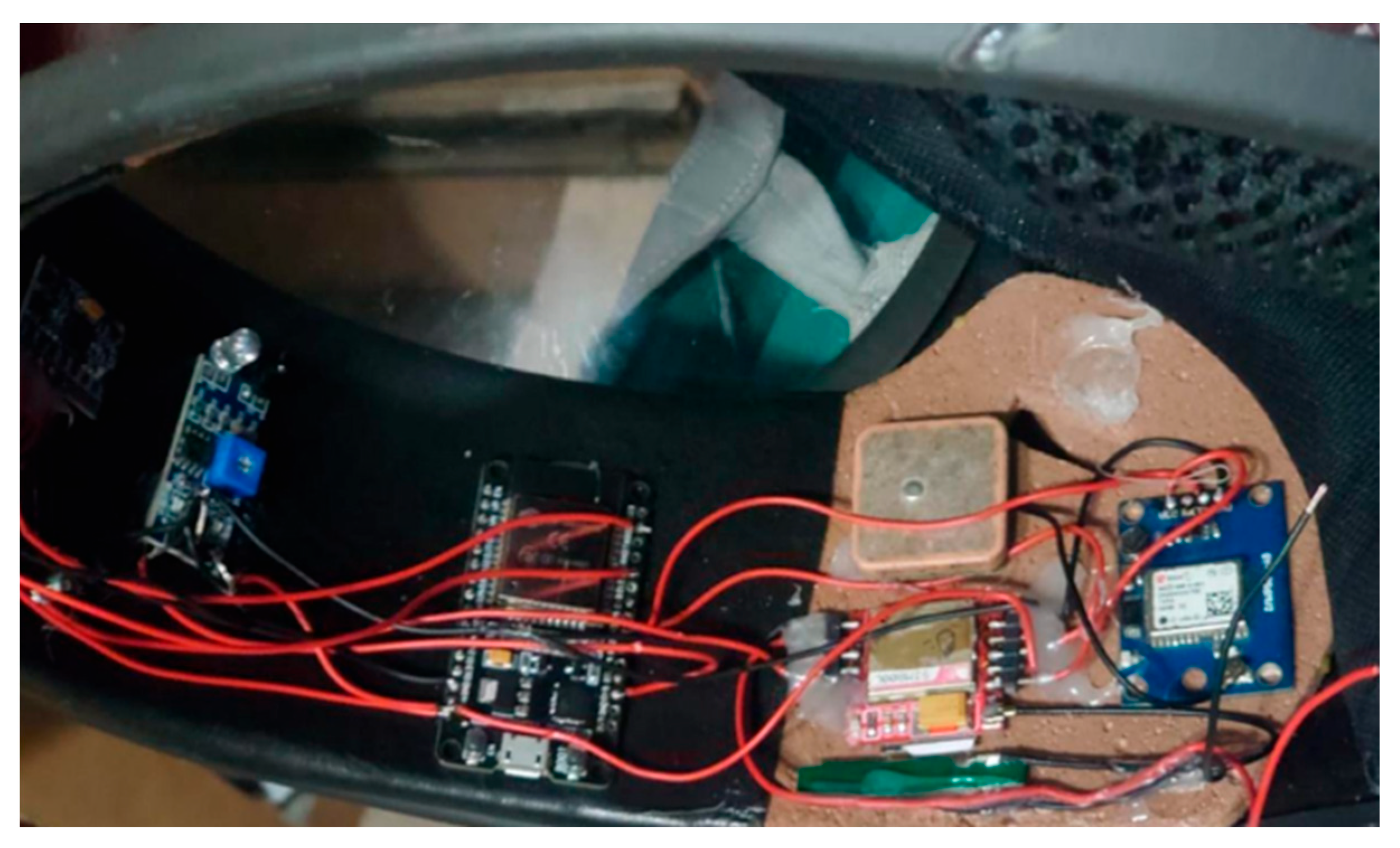 Figure 12 demonstrates the created prototype of the smart helmet hardware, which depicts the physical construction of the sensing, processing, and communication modules into the housing of the helmet. The main microcontroller is the ESP32, which is connected to the motion sensor, alcohol sensor, impact switch, GPS module, GSM module, and voice interface. Its components are installed in a small bench so that it is mechanically stable and comfortable to the rider. The prototype confirms the practicability of the implementation of numerous safety and communication subsystems into a wearable platform of a helmet. Interconnection delays (short interconnections) and centralization allow signal interference to be minimized and allow reliable operation (in real-time). The given hardware implementation shows that the proposed system can be effectively implemented into practice in terms of e-bike safety-based applications.