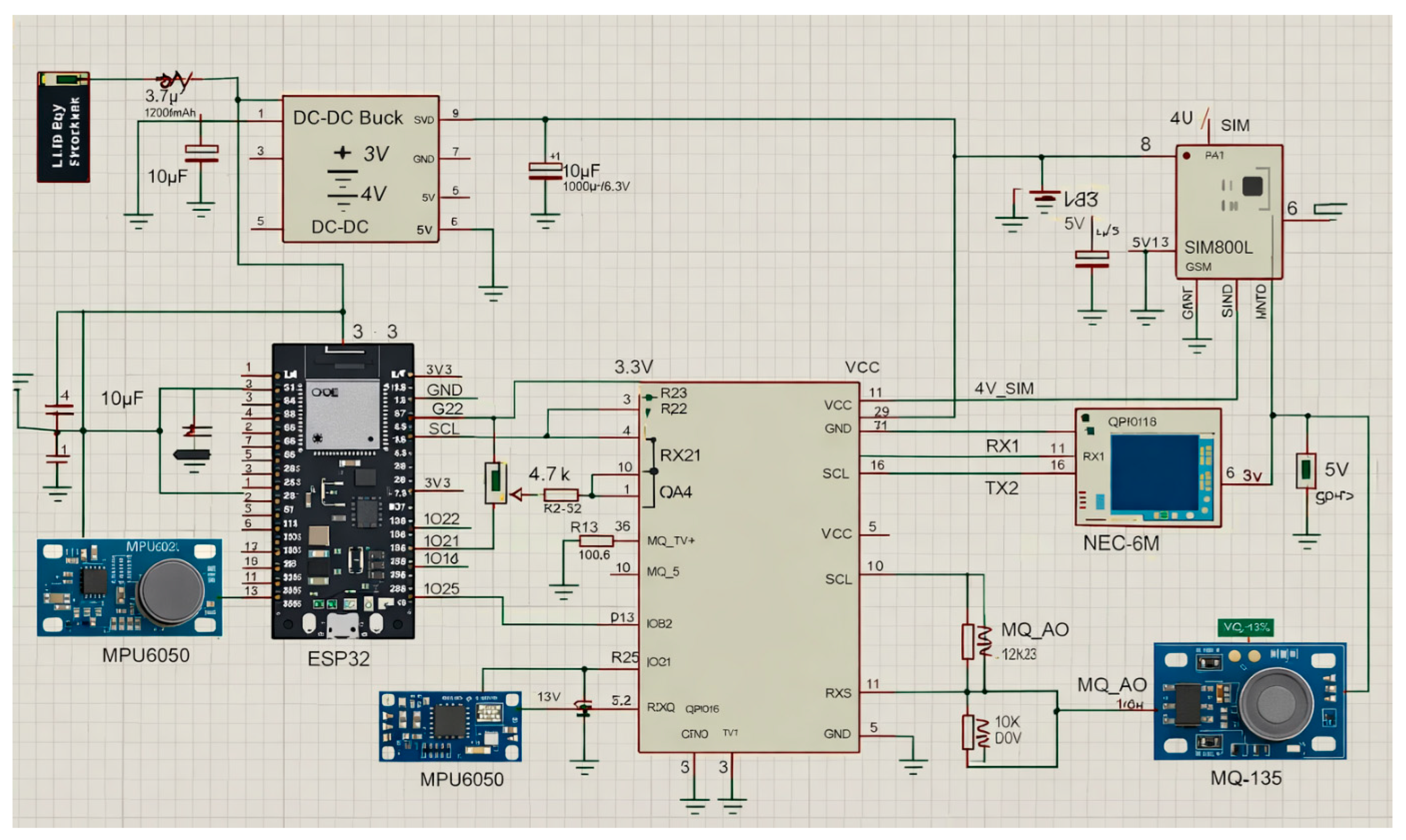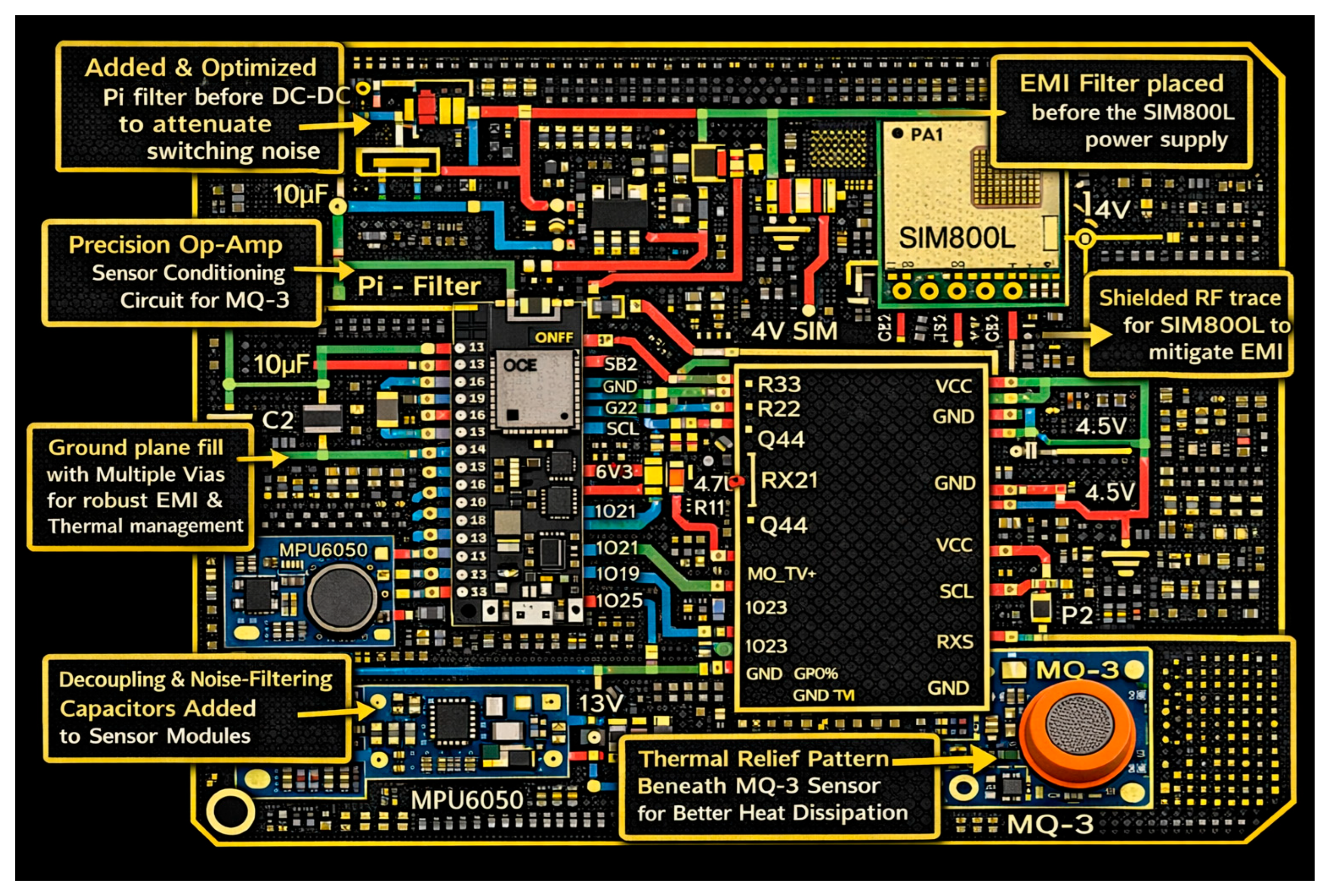 Figure 14), various design improvements are provided in order to enhance signal integrity, electromagnetic compatibility, and thermal performance. A Pi-filter goes before the DC-DC converter to reduce switching noise to stabilize the power supply. The SIM800L module has dedicated EMI filtering and shielded RF routing in order to reduce the electromagnetic interference and provide a reliable wireless connection. Signal conditioning circuitry of precise interfacing of sensors is incorporated and decoupling and noise-filtering capacitors are placed strategically close to sensitive components to improve measurement stability.