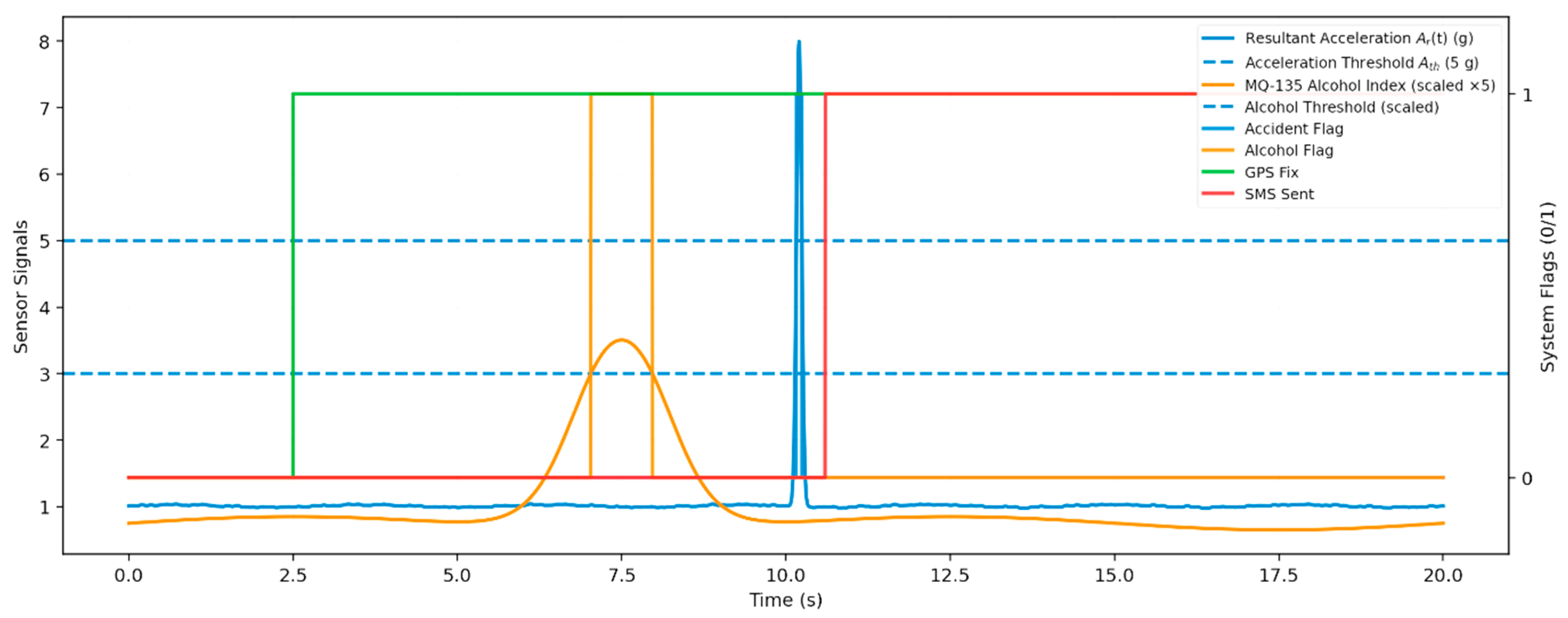Figure 16 presents the combined system behavior over time. The resultant acceleration remains below the threshold during normal riding and exceeds the threshold during the simulated impact event, which activates the accident detection flag. The MQ-3 alcohol index is shown with its threshold to illustrate sobriety monitoring, while the GPS fix status confirms location availability before emergency response. Following accident detection, the SMS transmission flag activates, demonstrating the event-driven workflow from sensing to emergency notification.