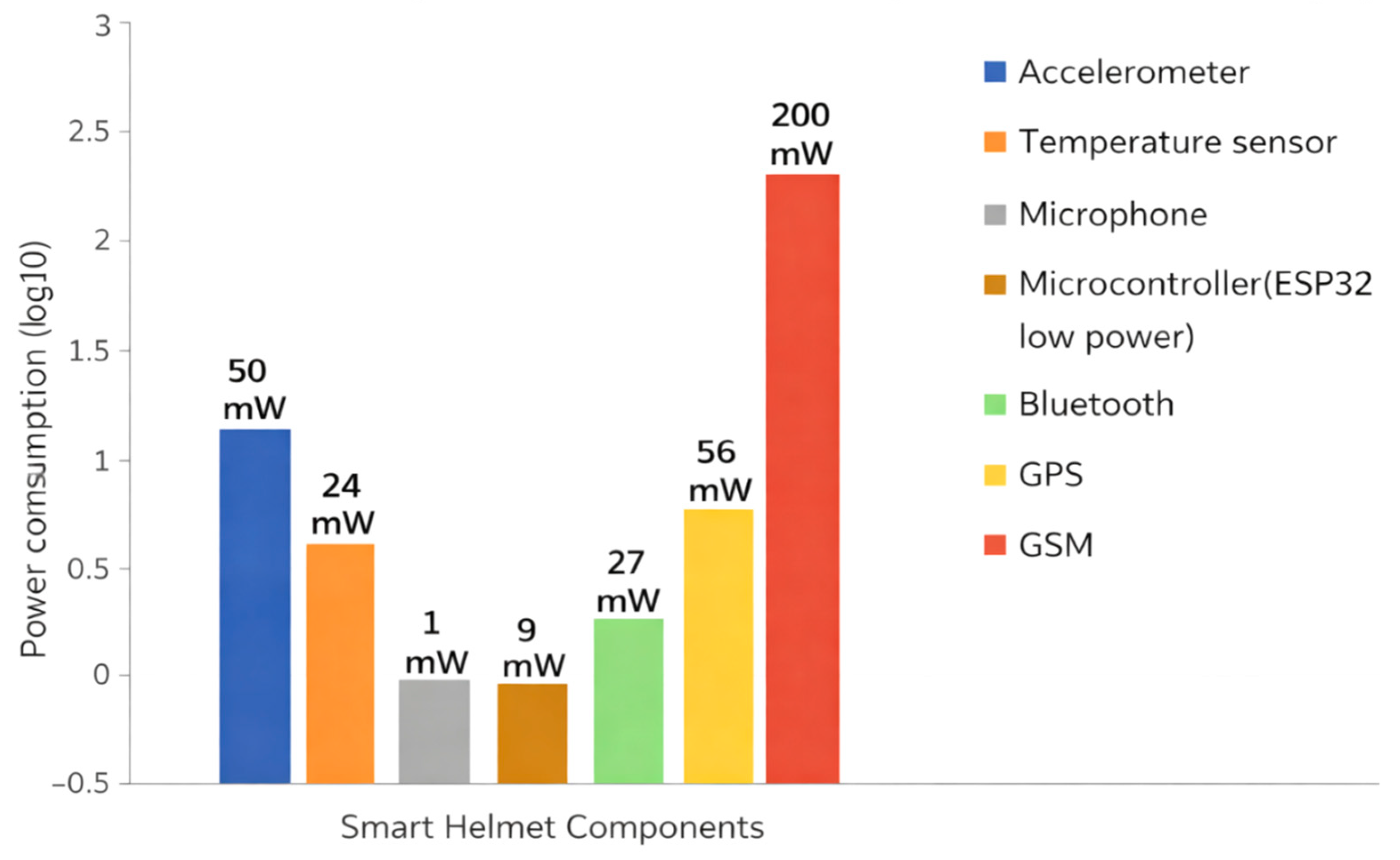 Figure 18 shows that the power consumption of important parts incorporated into the smart helmet system is contrasted in the picture. While communication modules like GPS and GSM have increased power requirements because of data transfer, low-power sensors like the accelerometer, temperature sensor, and microphone use less energy and enable continuous monitoring. This investigation emphasizes how crucial duty-cycling and energy-efficient operation are to extending battery life in wearable e-bike safety systems.