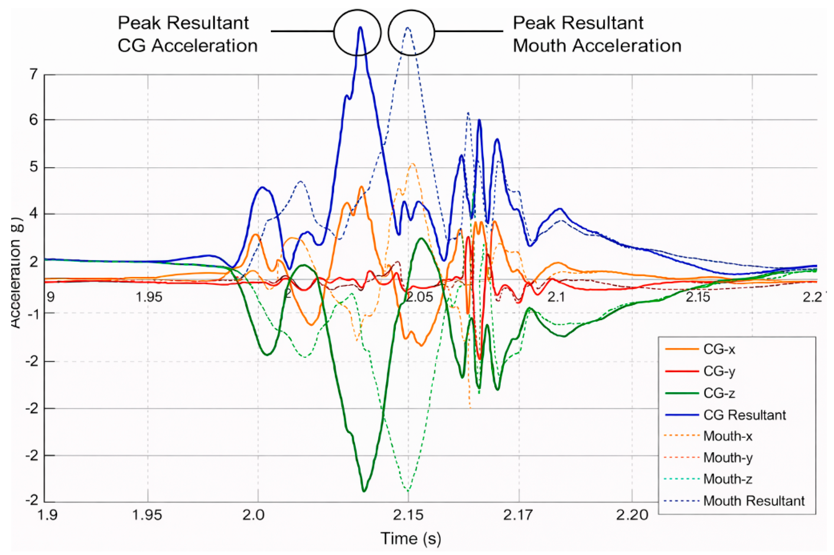 Figure 20 shows the acceleration responses of the time domain in the x-, y-, and z-axes, as well as the resulting acceleration, at the center of gravity of the helmet and the point of the mouth during an impact event. There are distinct maxima in the resultant acceleration at the two locations, which point to an event of a high severity. The magnitudes and time responses of peaks between the two locations indicate how sensor placement affects the measured acceleration, which substantiates the importance of resultant acceleration-based thresholding in reliably detecting accidents in the proposed smart helmet system. The comparison of commercial smart helmets and the proposed low-cost e-bike smart helmet is presented in