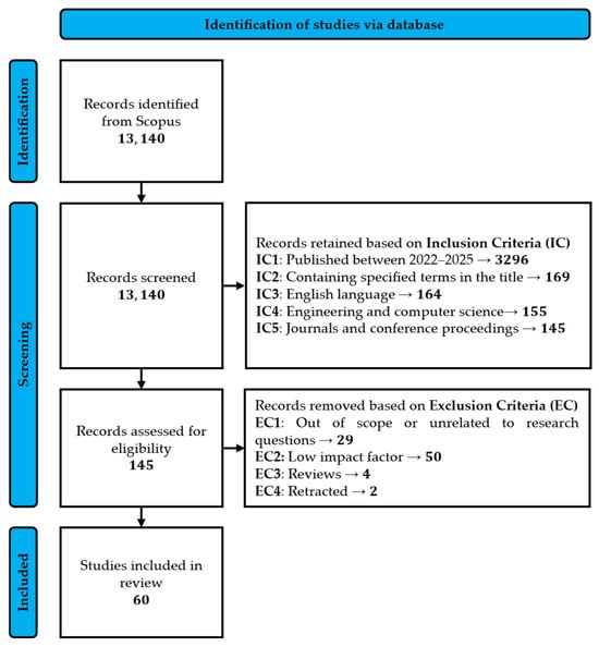 Based on this search scope, the broad query “TITLE-ABS-KEY (wsn OR (wireless AND sensor AND network*) AND industr*)” initially retrieved 13,140 records. To broaden coverage, the asterisk symbol served as a wildcard, capturing variations such as network/networks/networking and industry/industrial/industries. After applying the inclusion criteria, the dataset was reduced to 145 published works. The screening and exclusion decisions are summarised in the PRISMA flow diagram (Figure 1), resulting in a final set of 60 included articles. The applied search string, filters, and parameters are summarised in Table 3.