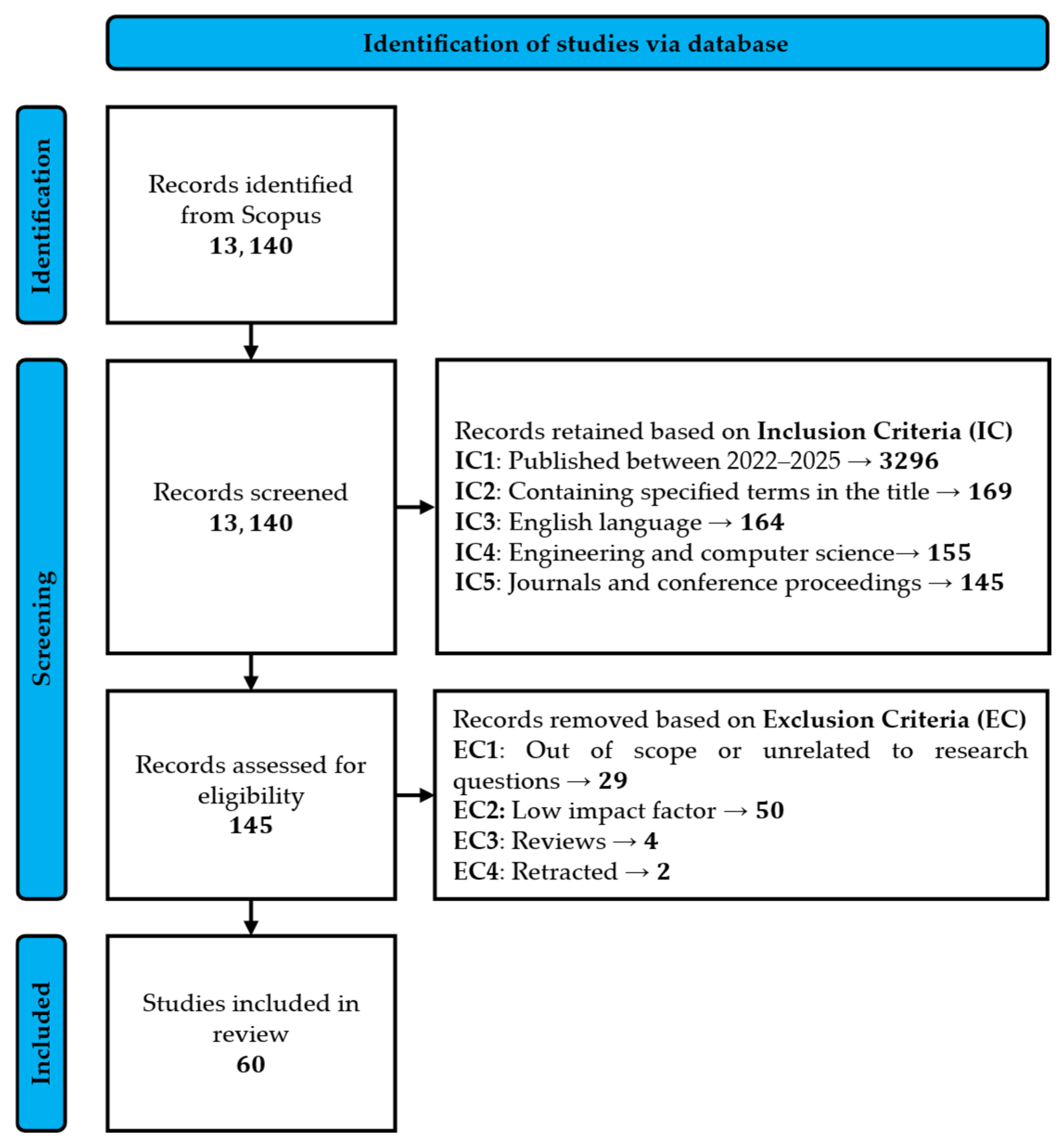 Figure 1), resulting in a final set of 60 included articles. The applied search string, filters, and parameters are summarised in